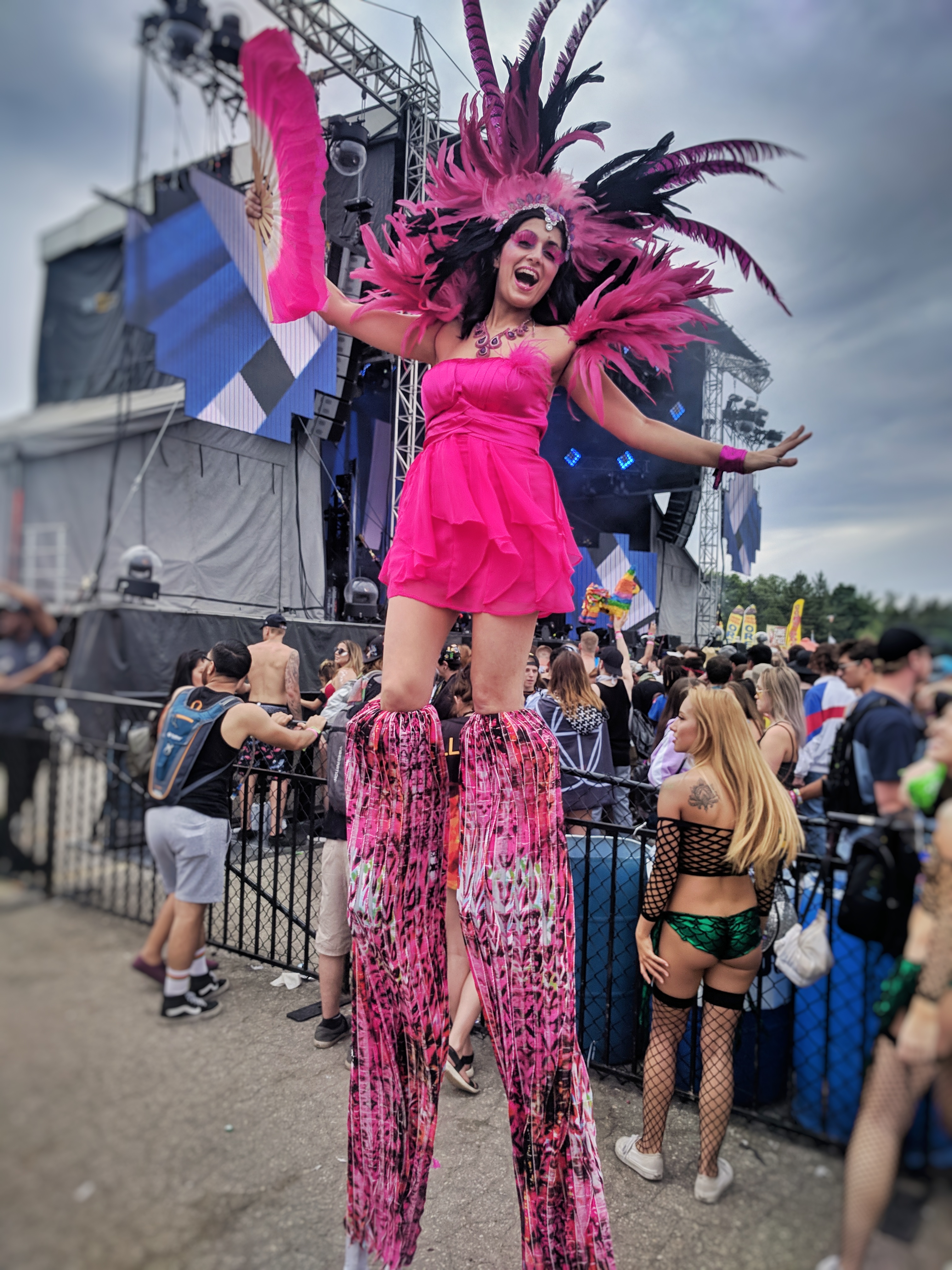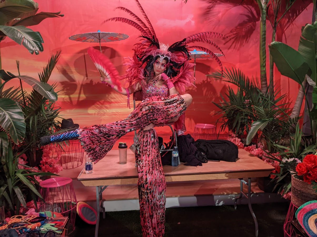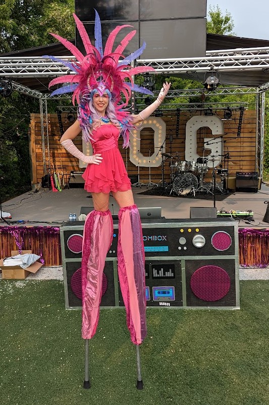 Pink Flamingos on stilts! These carnival feathers are perfect to brighten any summer event. Two different options – Black and Pink flamingo or pink and purple flamingo – or both! If hot pink is your event colour we also have a Pink Candyland ringmaster on stilts.