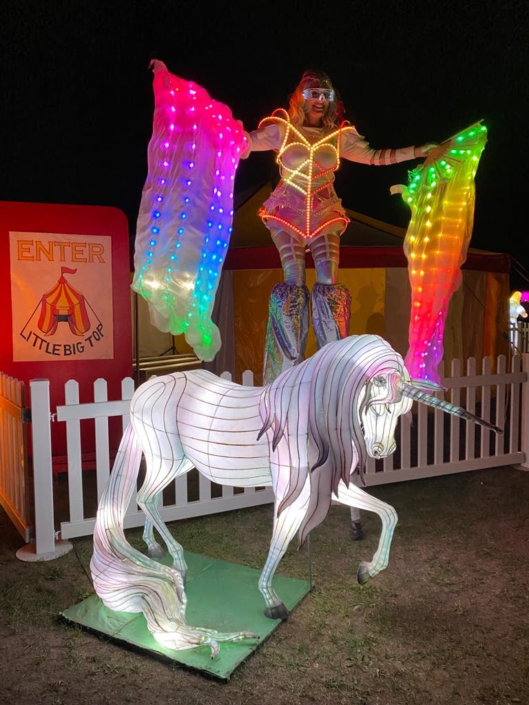 We also feature several other LED costumes characters on stilts: LED Crystal Queen and Fiber Optic Fun