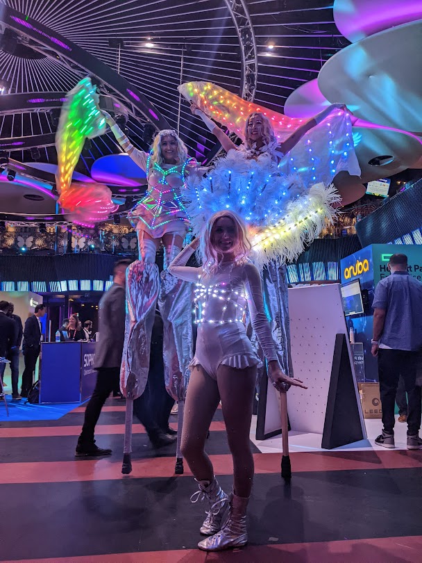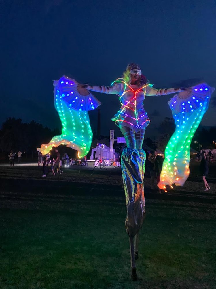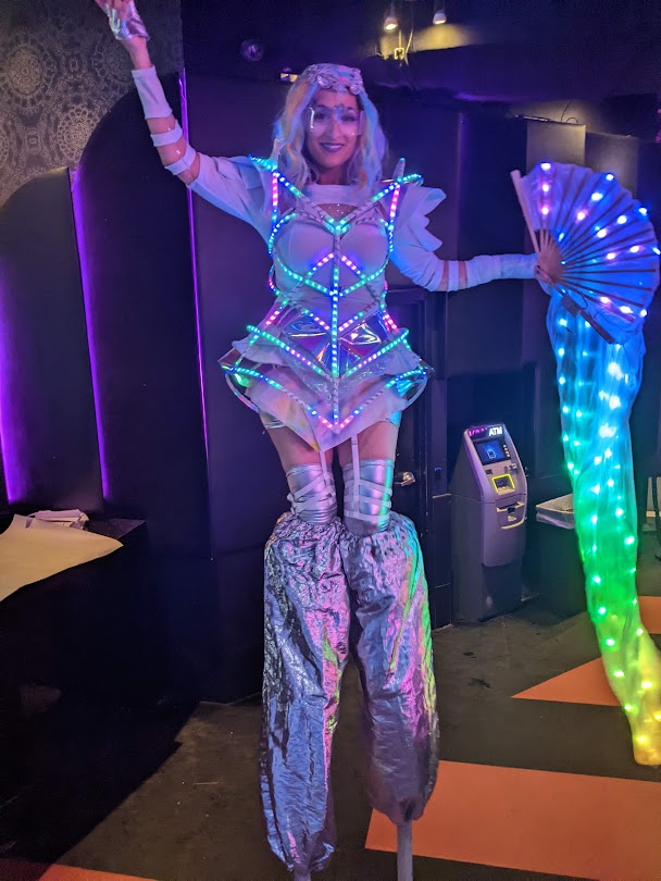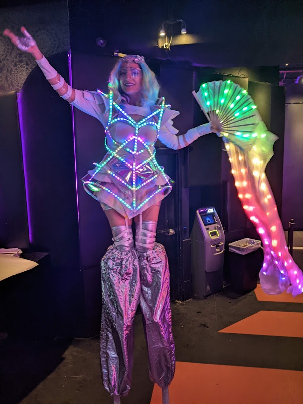 Aurora’s custom Programable LED Cage dress on stilts and Smart LED Fans will light up any event to the max! These lights are super bright in any lighting. This programable dress can be preset to feature your events selected custom colours.