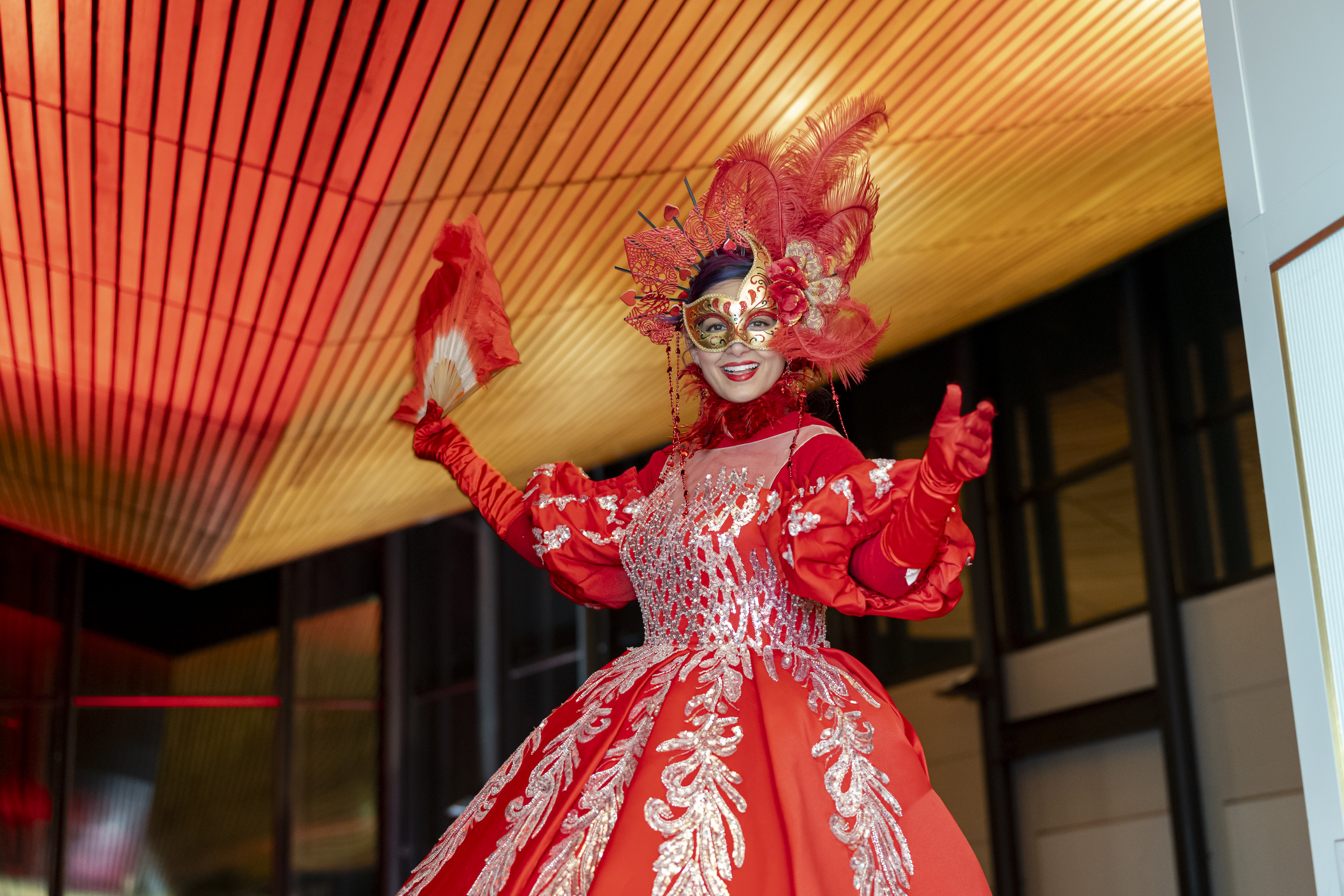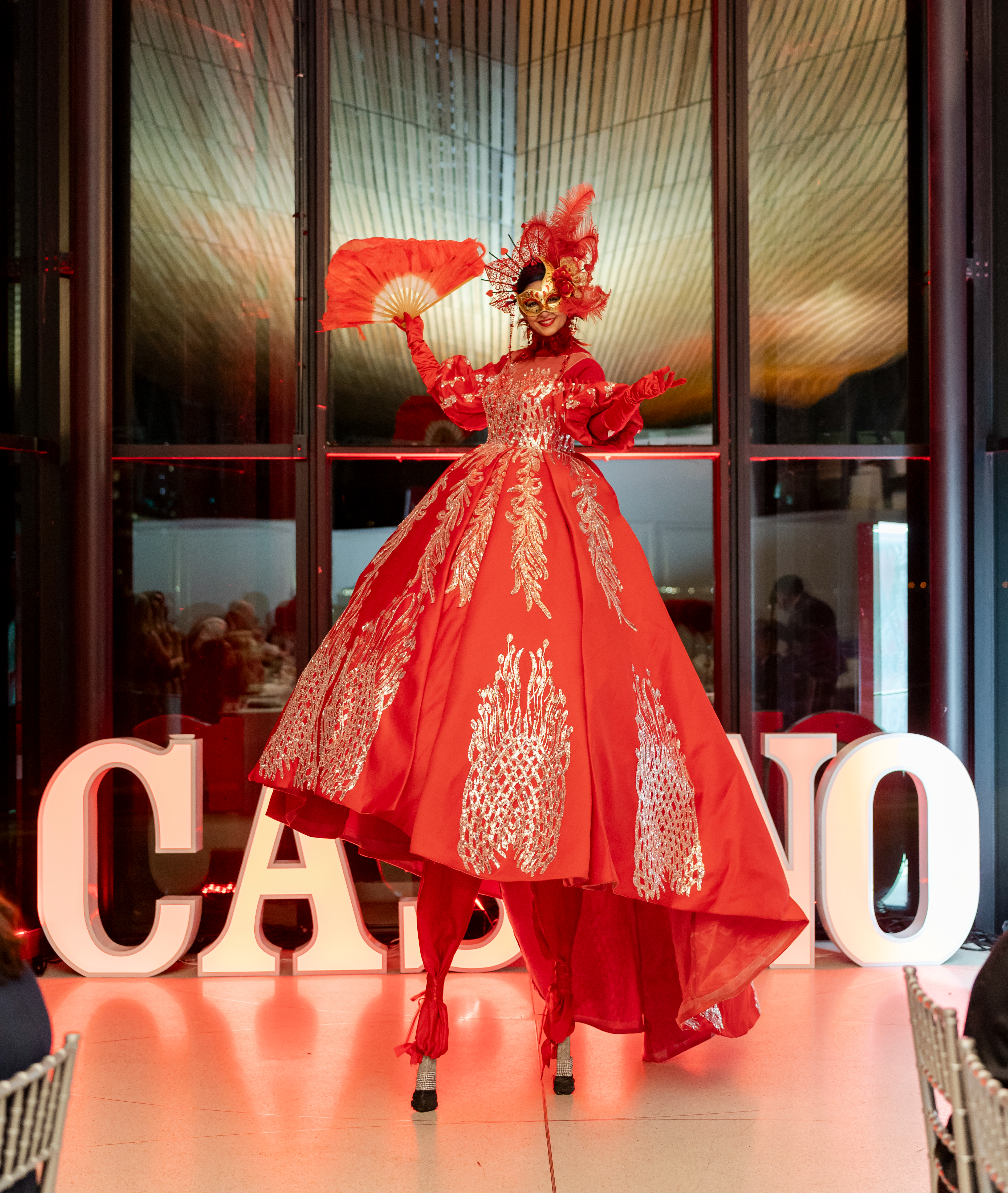 The most elegant Regal Ruby gown glides on stilts at your next special event. If your event colour is red consider inviting her to welcome your guests.