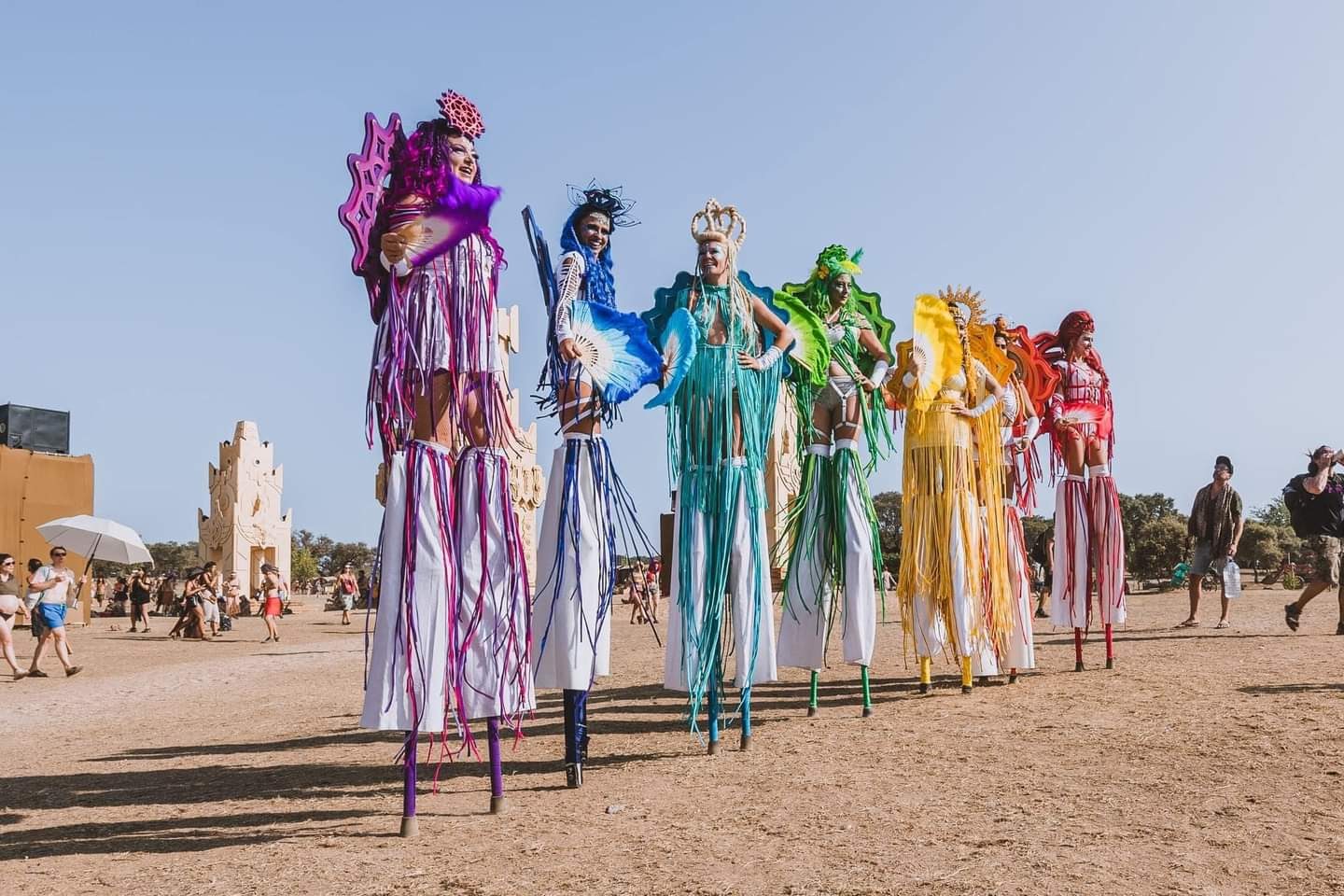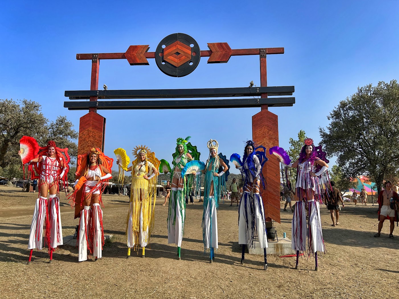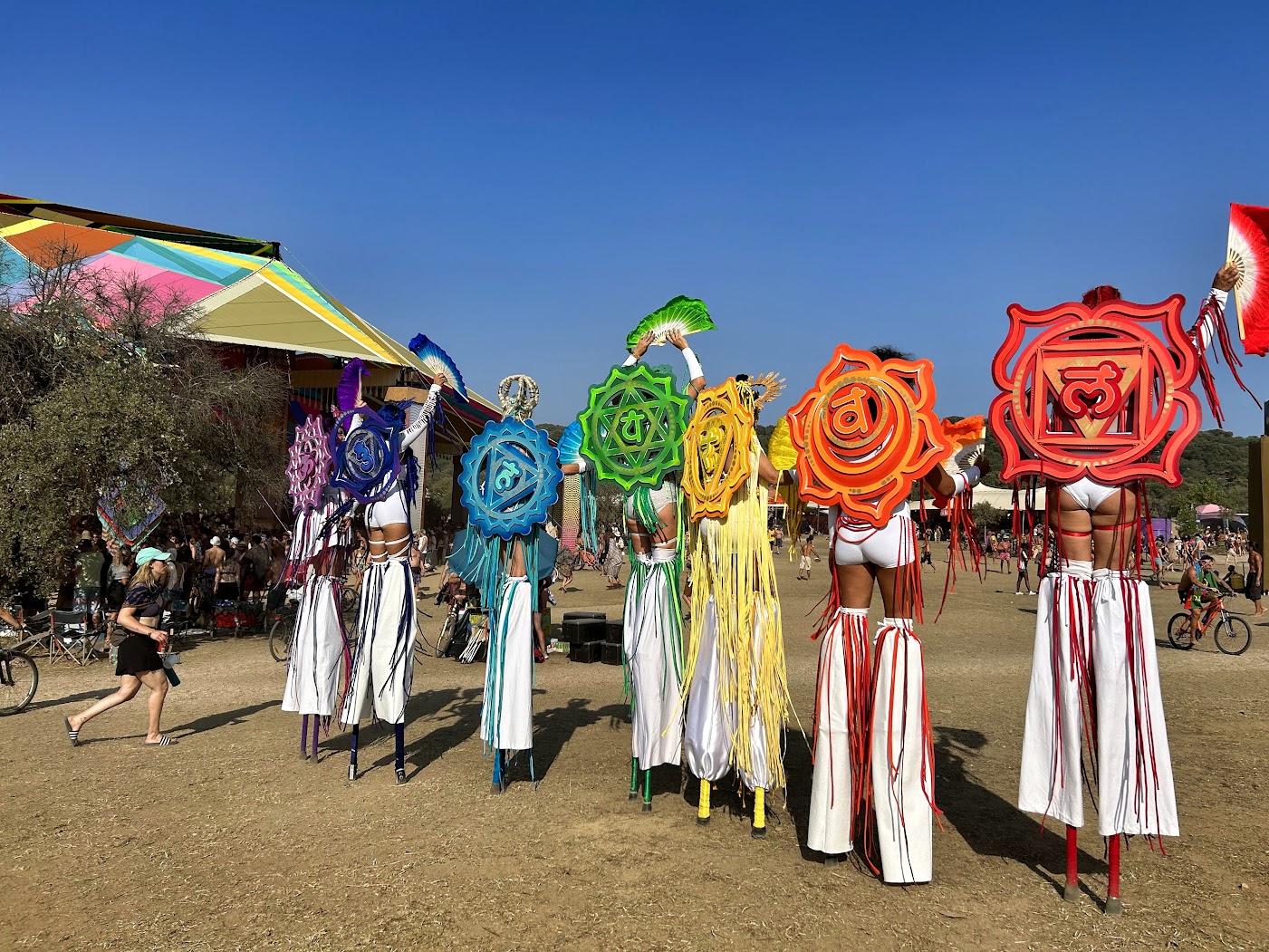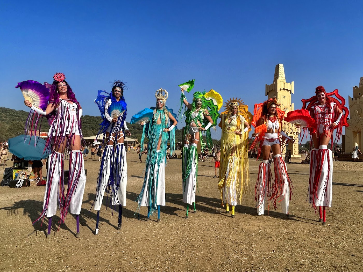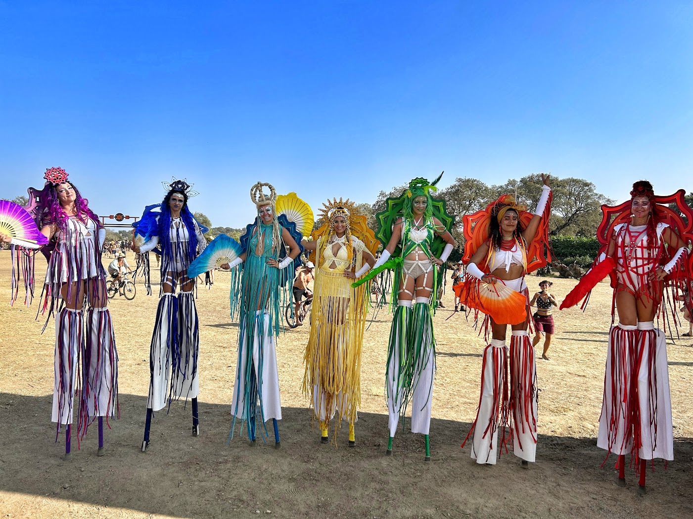 Seven Chakras on Stilts! Concept envisioned by Mystika Circus based in Montreal, we seven friends and veteran stilt-walkers collaborated together from Mexico, USA, Montreal, Toronto and as far as Australia to make this magic happen for Boom Festival Portugal in July 2023. My yellow sun goddess character is available in The Toronto Area without the chakra back piece and can be substituted for a yellow feather back piece.