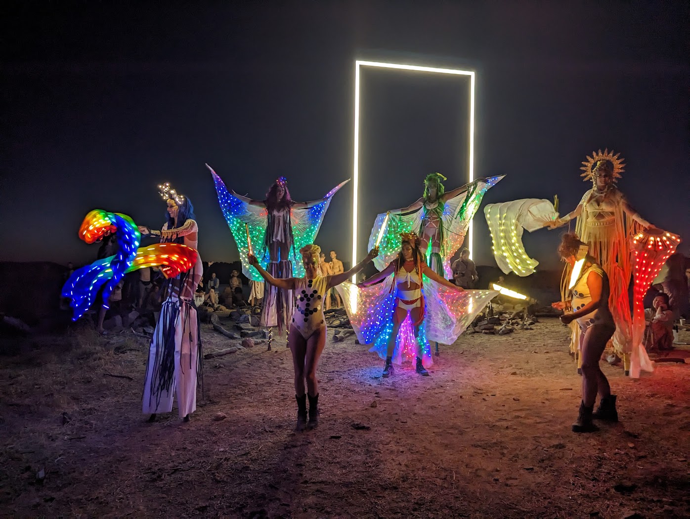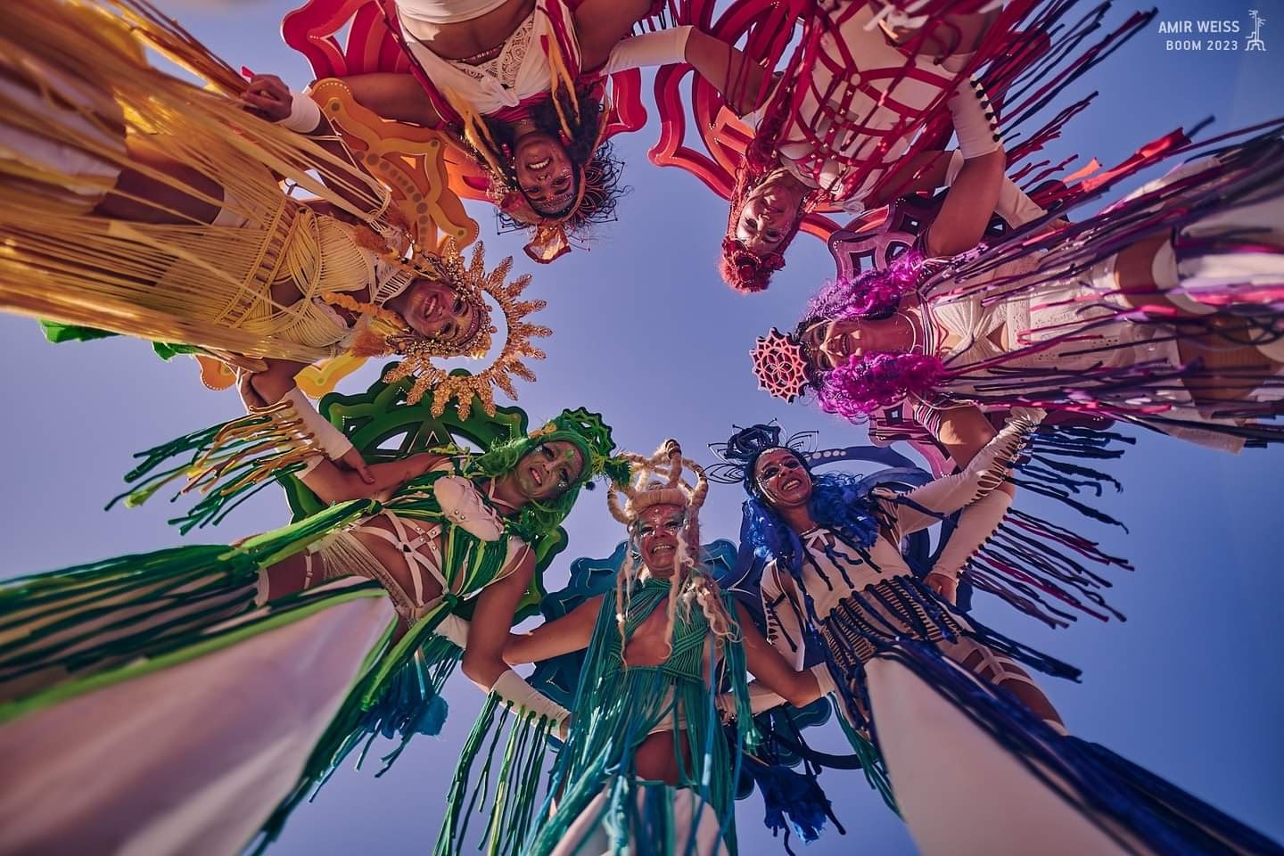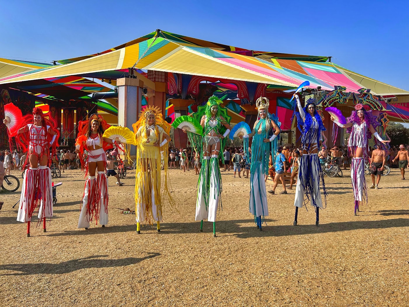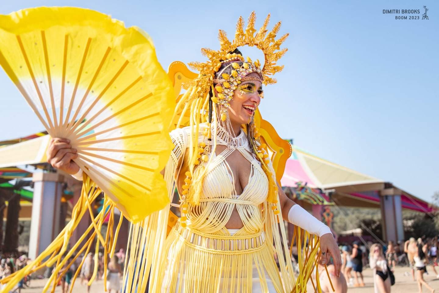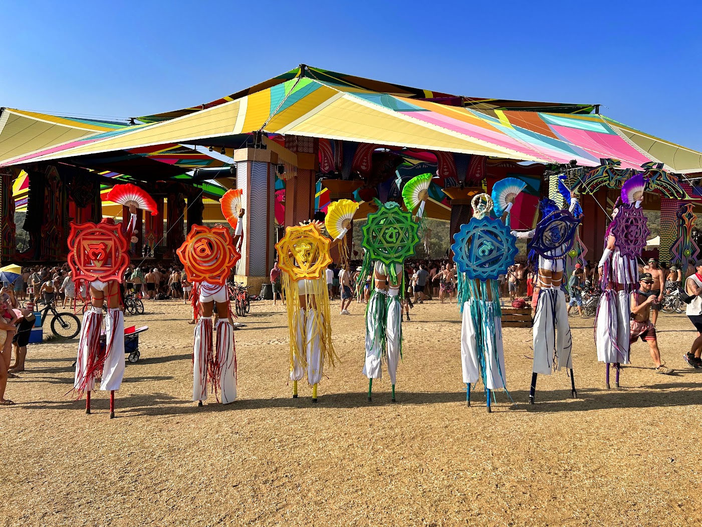 Seven Chakras on Stilts! Concept envisioned by Mystika Circus based in Montreal, we seven friends and veteran stilt-walkers collaborated together from Mexico, USA, Montreal, Toronto and as far as Australia to make this magic happen for Boom Festival Portugal in July 2023. My yellow sun goddess character is available in The Toronto Area without the chakra back piece and can be substituted for a yellow feather back piece.