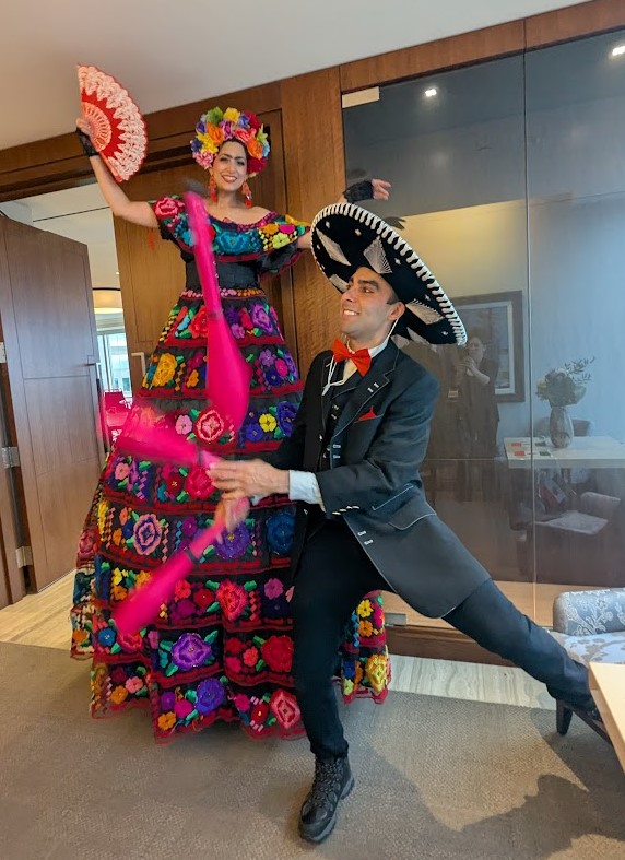 Make it a full fiesta by pairing with our authentic Mariachi performer on stilts, or our hilarious Lucha Libre wrestler character, played by a real Mexican stilt performer/juggler who always brings the laughs! Want to add a festive twist? The styling can be adapted with sugar skull details for Día de los Muertos celebrations.