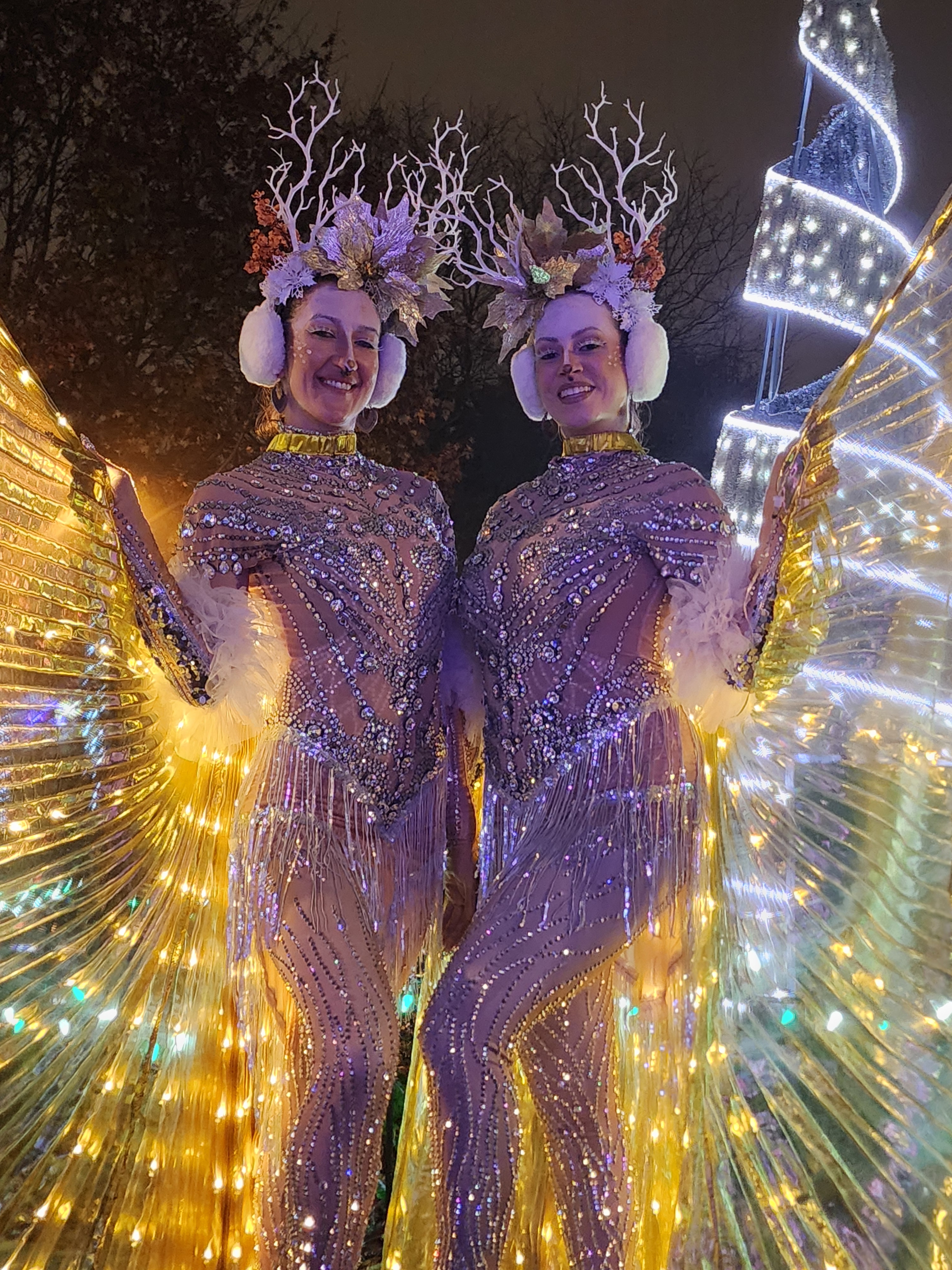 Bring winter magic to your event with our Flying Frosted Fawns! Dancers dressed in shimmering silver and gold with floral antler headpieces and frosted white makeup. With their gold LED wings they make stunning greeters or captivating dancers. Adaptable for indoor or outdoor events in winter, they add sparkle and enchantment to any celebration.