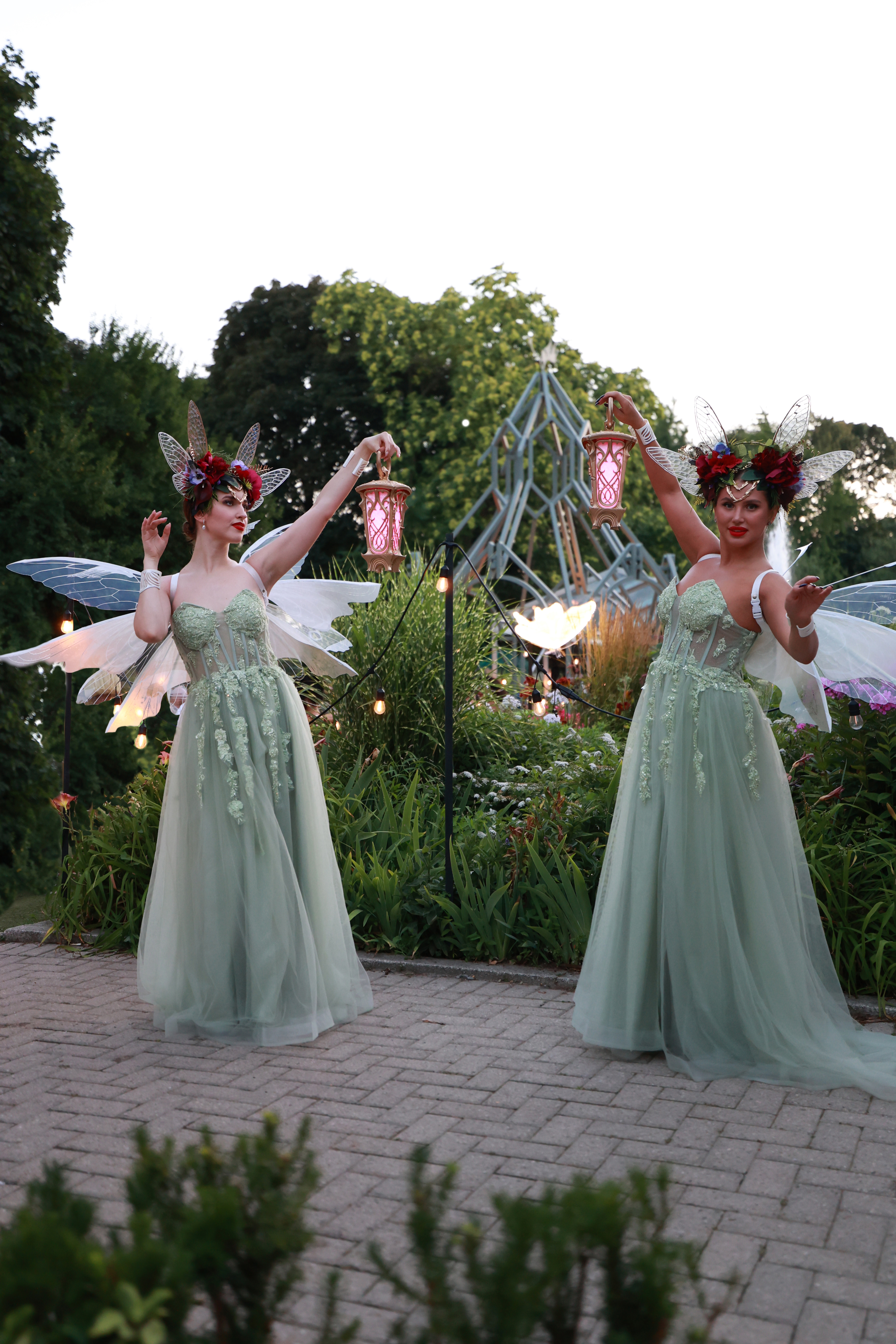 Welcome your guests with a touch of ethereal beauty. Our Elegant Fairy Greeters float through your event in flowing mint-green gowns with shimmering, translucent wings and glowing lanterns that light the way. Perfect for evening galas, winter wonderlands, and enchanted garden themes, these fairies bring grace, warmth, and a soft touch of magic to every arrival.
