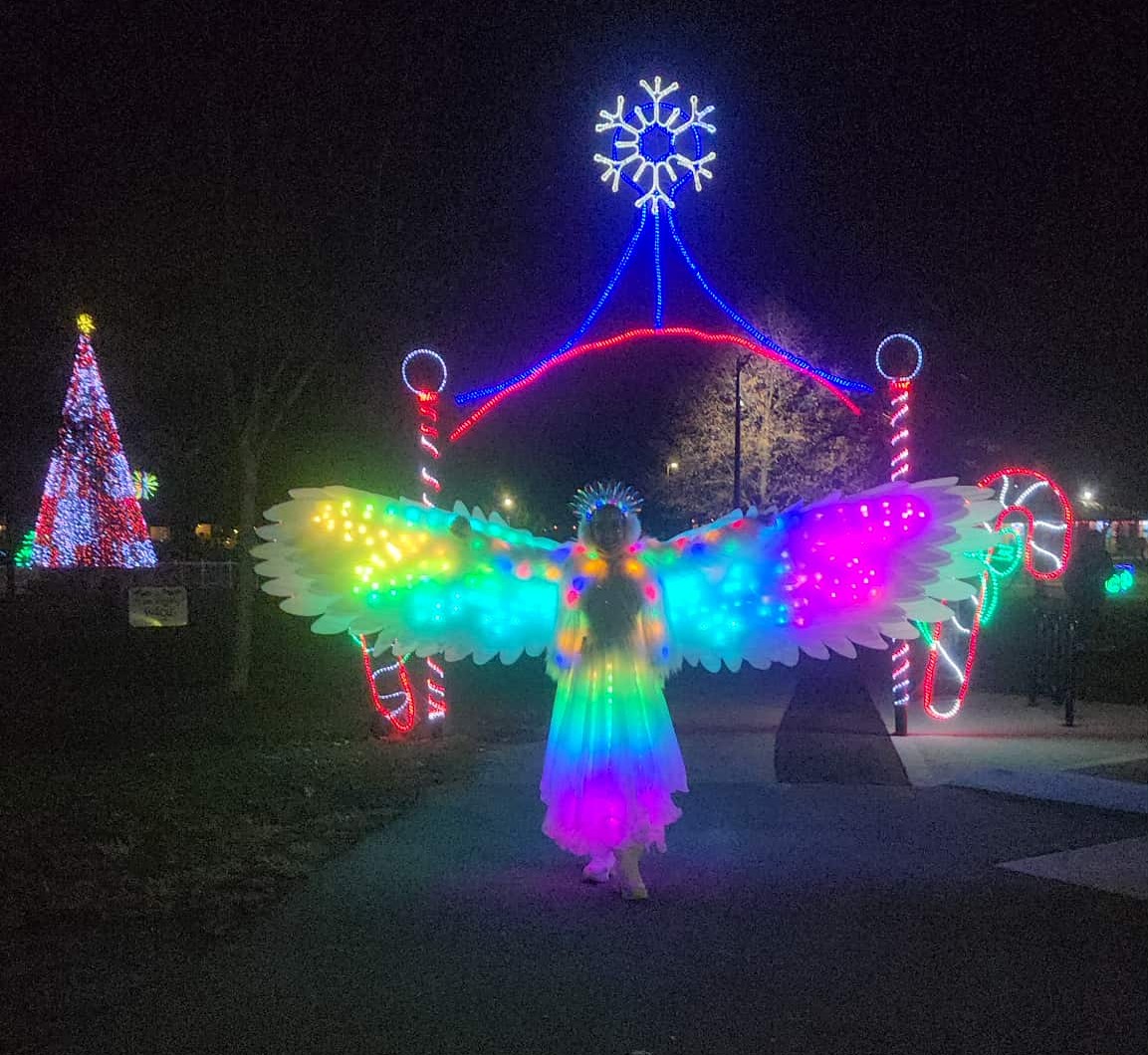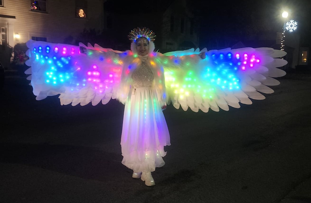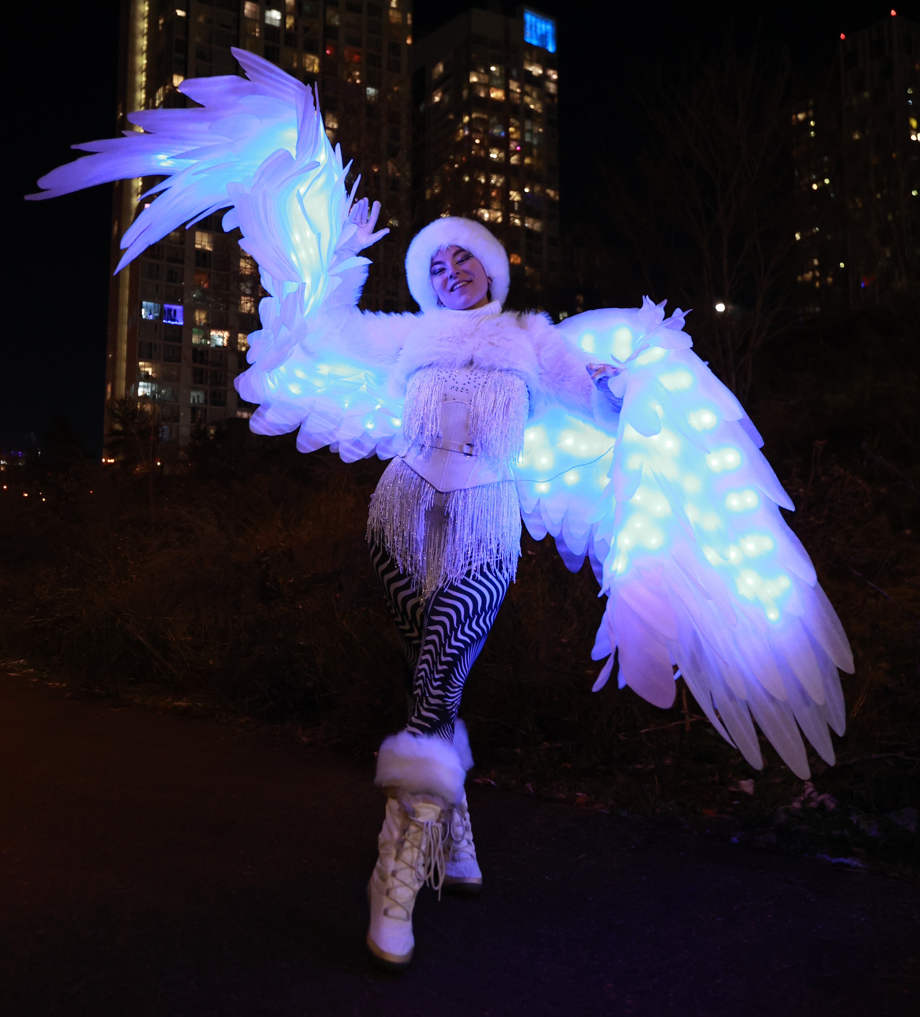 Available as a ground single or duo – or with one performer elevated on stilts – they create a dynamic visual experience that captivates audiences of all ages. Their LED wings can display soft winter hues, sparkling animations, or custom patterns for an extra personalized touch.
